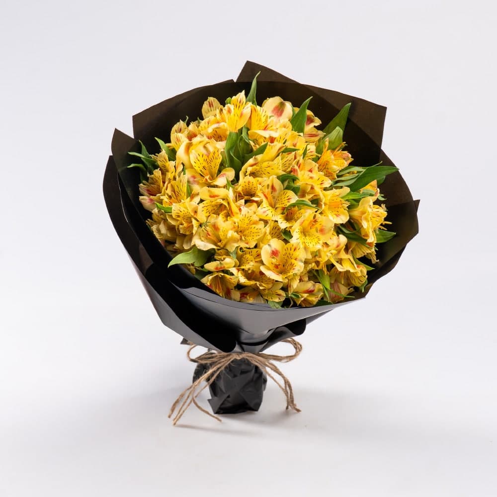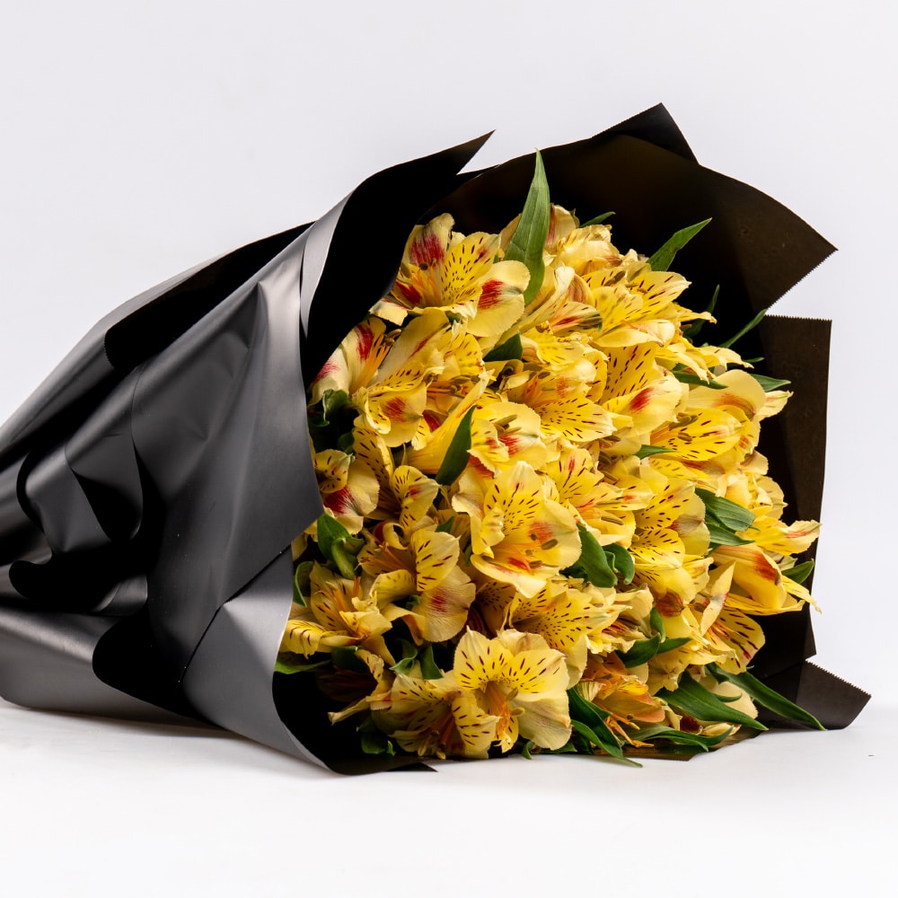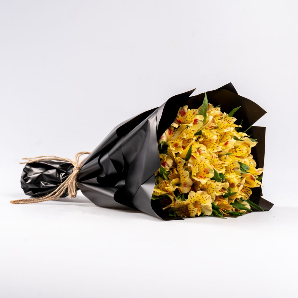A stunning bouquet of fresh Alstroemeria, beautifully wrapped in an elegant black wrapper for a modern and sophisticated touch. Known as the Lily of the Incas, Alstroemeria symbolizes friendship, love, and prosperity, making this bouquet a perfect gift for any occasion.