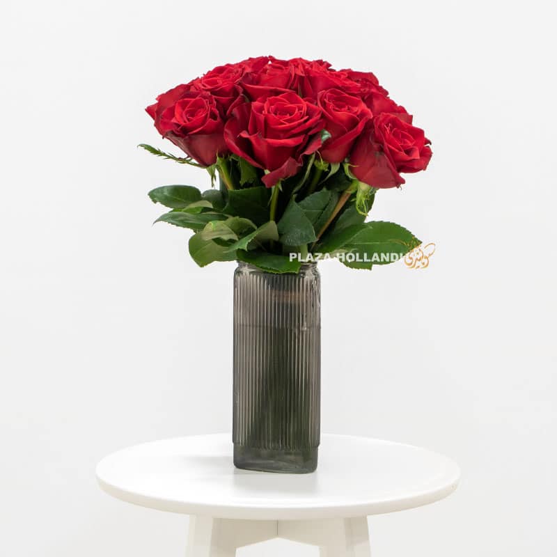 Express your deepest emotions with the classic elegance of 15 Red Roses in a Vase from Plaza Hollandi. This timeless arrangement features a vibrant collection of long-stemmed red roses, expertly arranged in a sleek vase.