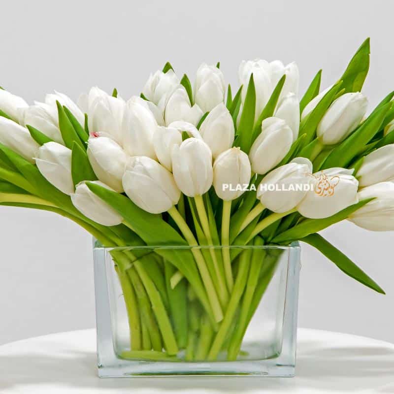 50 beautiful white tulips arranged in a glass vase. Place your order before 5 pm for same day delivery.