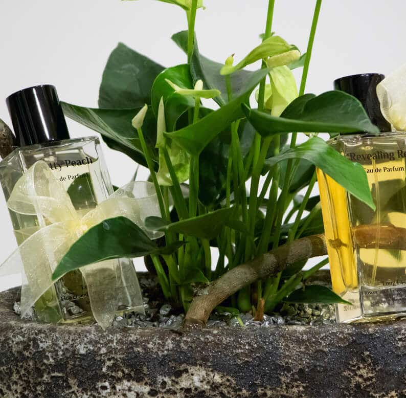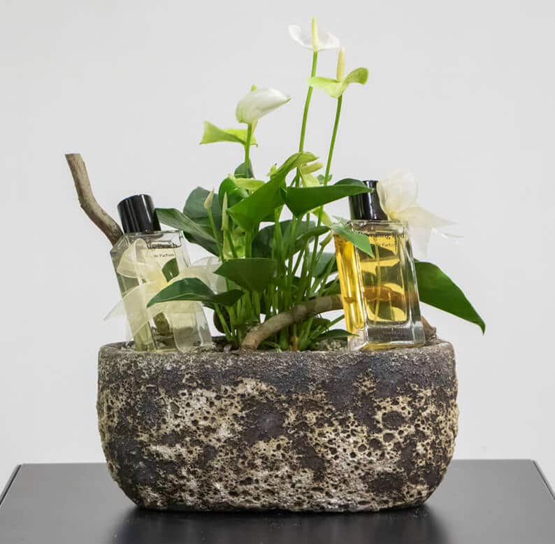 A beautiful gift for her.  An elegant anthurium plant in the middle of an antique basin with two perfumes.  For the morning, Pretty Peach perfume consisting of saffron, tea rose and musk and for the evening Revealing Red Perfume with oud, amber and patchouli. The Anthurium needs water once a week.