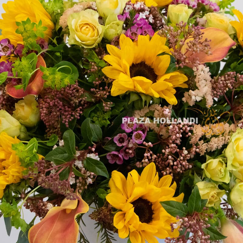 - Long-lasting Cheer: Plaza Hollandi’s florists meticulously select blooms known for their vase life, ensuring the vibrant colors and sunny disposition of this arrangement last.