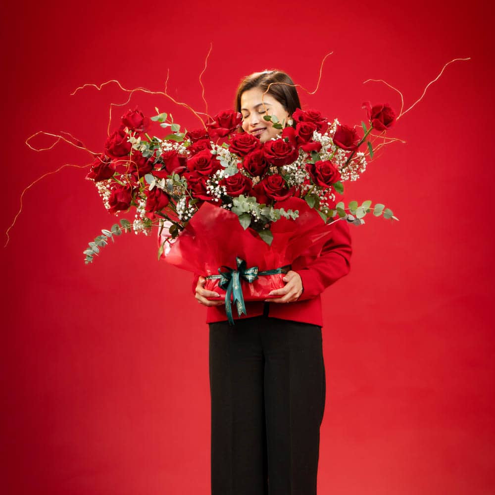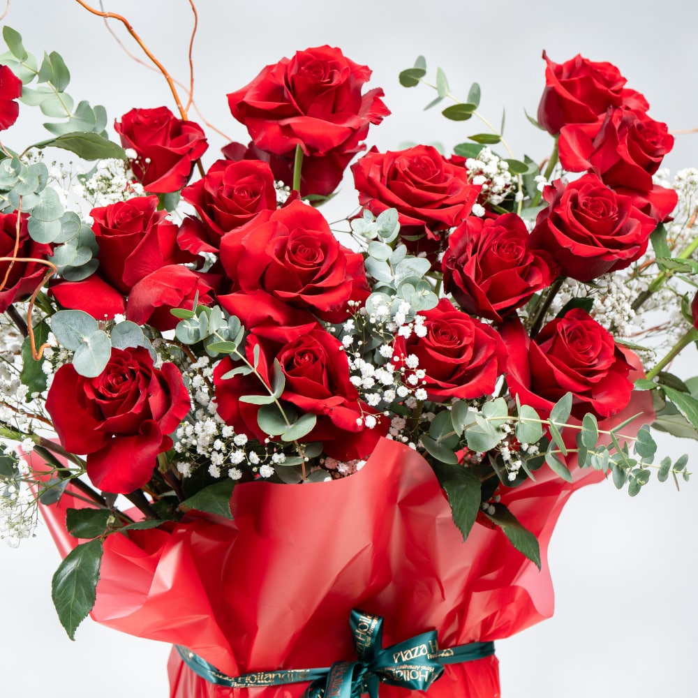 The Red Roses, Gypsophila & Eucalyptus with Salix (H 28 cm) reflects refined floral artistry inspired by nature and romance. To explore this arrangement and other luxury floral designs, visit our locations and experience premium flower delivery in Abu Dhabi with Plaza Hollandi UAE.