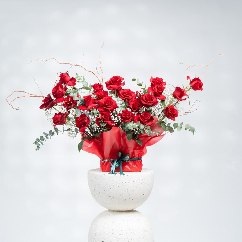 The Red Roses, Gypsophila & Eucalyptus with Salix (H 28 cm) arrangement is a refined floral expression that blends classic romance with organic movement. Featuring rich Red Roses softened by airy Gypsophila, layered with aromatic Eucalyptus and sculptural Salix branches, this design offers depth, elegance, and visual harmony. Handcrafted by Plaza Hollandi UAE for discerning clients in Abu Dhabi, it is ideal for sophisticated gifting and intimate spaces.